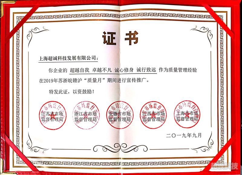 2019年9月1日,以“守初心勇?lián)?dāng)強(qiáng)質(zhì)量圓夢想”為主題的2019年蘇浙皖贛滬“質(zhì)量月”共同行動啟動儀式在南京舉行。市場監(jiān)管總局副局長、國家標(biāo)準(zhǔn)委主任田世宏,江蘇省政府副省長王江出席啟動儀式并講話。9月2日,舉辦了蘇浙皖贛滬企業(yè)家質(zhì)量講堂活動,來自五省市的企業(yè)代表在會上分享了優(yōu)秀質(zhì)量管理經(jīng)驗(yàn),共同發(fā)出了開展100家企業(yè)質(zhì)量管理經(jīng)驗(yàn)宣傳的通知,形成2019年蘇浙皖贛滬“質(zhì)量月”共同行動宣傳材料匯編,開展百家企業(yè)質(zhì)量管理經(jīng)驗(yàn)宣傳工作。其中,上海超誠科技發(fā)展有限公司作為中國質(zhì)量獎提名獎代表參加活動,公司打造的“超越自我、卓越不凡、誠心修身、誠行致遠(yuǎn)”體系作為質(zhì)量管理經(jīng)驗(yàn)在2019年蘇浙皖贛滬“質(zhì)量月”期間進(jìn)行宣傳推廣,并為上海超誠頒發(fā)了榮譽(yù)證書。上海超誠推行“公司+基地+高校院所(工程中心)+標(biāo)準(zhǔn)+品牌”的電磁鐵紡配產(chǎn)業(yè)創(chuàng)新模式,形成“一體化帶動標(biāo)準(zhǔn)化,標(biāo)準(zhǔn)化促進(jìn)規(guī)?;钡摹俺\模式”在全國得到推廣。